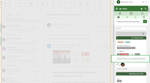 Most of your incoming tasks come to you by mail. With iPlanner Pro you can create, update and manage your Planner tasks directly in Outlook - including saving mail attachments or saving the e-mail. You can also book time in your calendar to work on your tasks and filter them by plan, bucket, label or status.