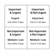 - Not Important & Urgent: Time-sensitive but lower-impact tasks (often interruptions or admin work)